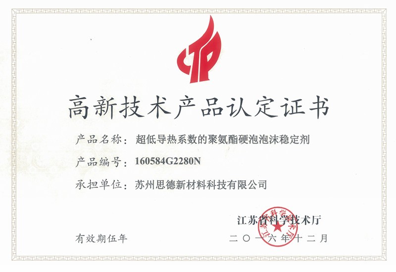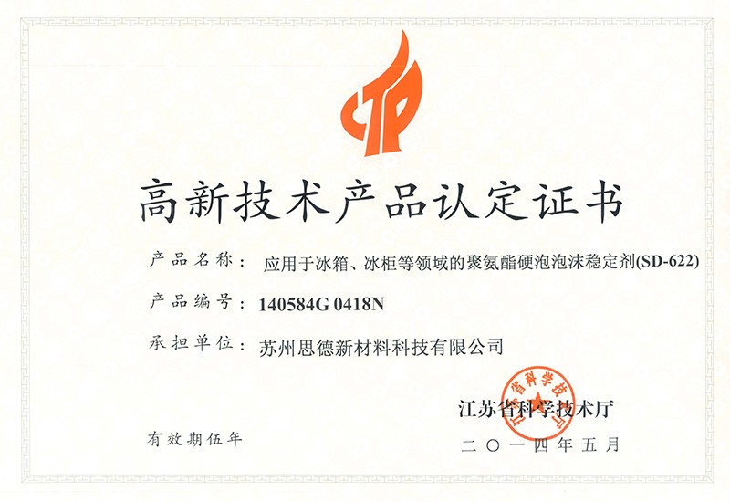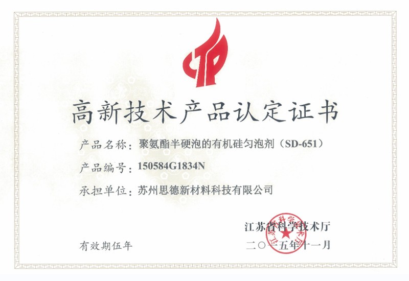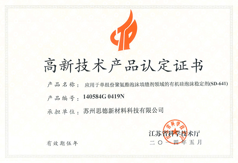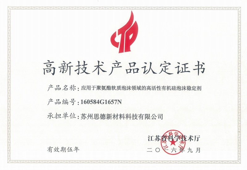 公司目前在售產品主要有聚氨酯硬泡用有機硅泡沫穩定劑系列產品、聚氨酯軟泡用有機硅泡沫穩定劑系列產品、聚氨酯OCF用有機硅泡沫穩定劑系列產品、聚氨酯高回彈用有機硅泡沫穩定劑系列產品、聚氨酯慢回彈用有機硅泡沫穩定劑系列產品,其中有20多個產品被認定為江蘇省高新技術產品。